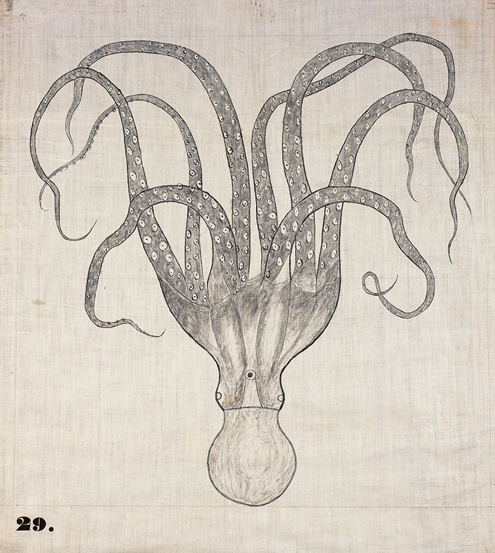 "Drawing of an Octopus", 1828-1840, 58 x 49 cm., Pen and ink on linen Image courtesy of Edward and Orra White Hitchcock Papers, Amherst College Archives and Special Collections, Amherst College Library.