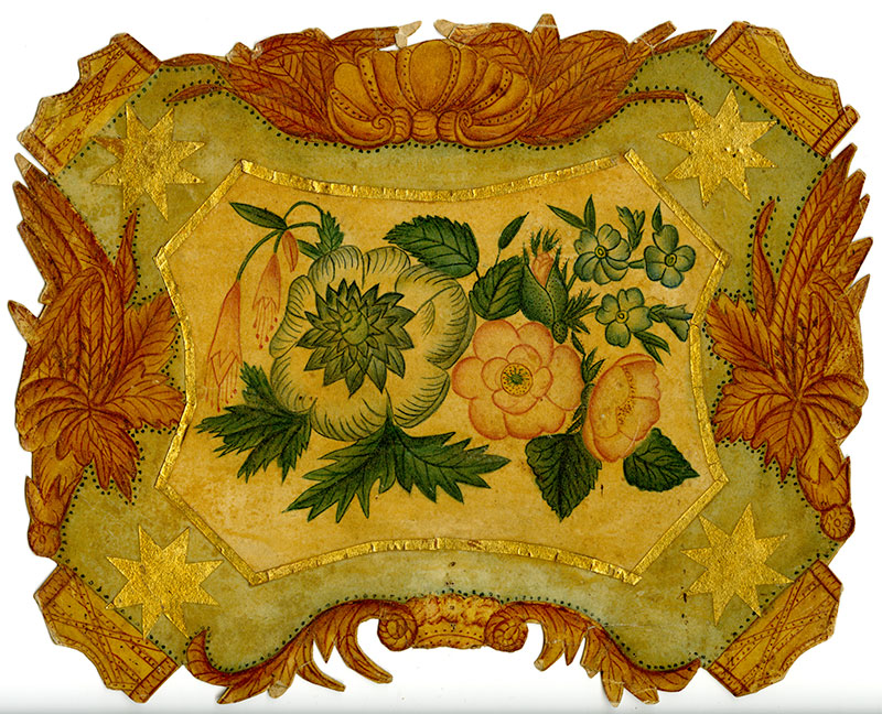 This fire screen (missing its handle) was painted by Charlotte A. Catlin while a pupil of Orra White at Deerfield Academy in 1817. The shiny gold stars and border, intended to reflect the fireplace light, were applied after she completed the painting.