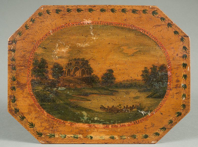 As part of her studies in the ornamental arts at Deerfield Academy, Adeline Hoyt painted a wooden box in 1817. All that remains of the box is the top, which depicts unidentified ruins in Europe, a scene likely copied from a print.