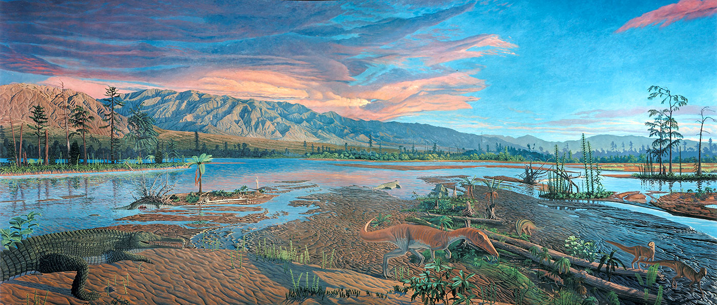 "Late Afternoon in the Late Triassic", 1991, 14’ x 29’, oil on masonite; Image courtesy of Dinosaur State Park and Arboretum.