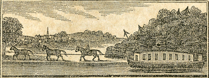 Detail from the previous slide showing the illustration over the list of canals. The picture shows a boat being pulled by a string of three horses through a canal in a hilly region.