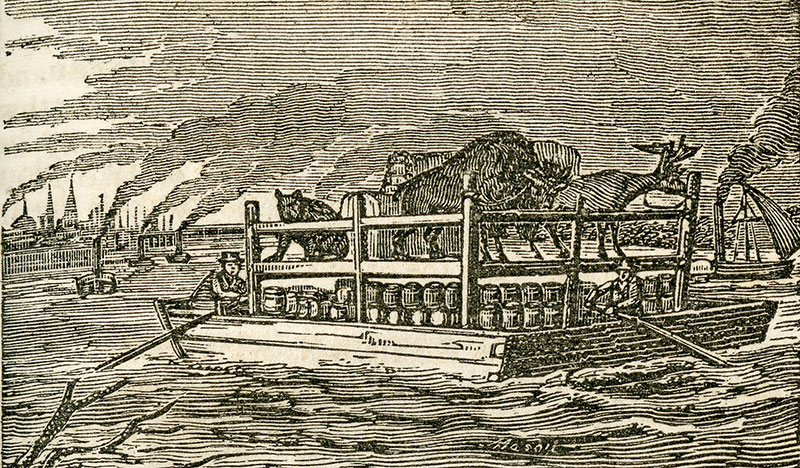 This flat-bottomed boat on a large American river is carrying animals symbolic of the west: elk, buffalo and bear. These animals are perhaps on their way to a traveling menagerie (zoo), a popular form of entertainment at the time. By the early 1820s there were 30 or more traveling menageries touring the eastern states.