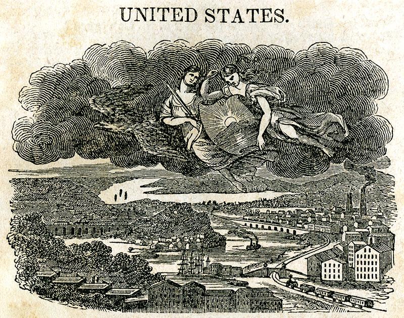 Where there’s smoke, there’s progress and prosperity! Here the twin sisters of "Industry" and "Commerce", holding a shield bearing a rising sun, are carried through the heavens by an American eagle upon billowing smoke from factories, trains, and steamboats in a landscape filled with engineering marvels and impressive architecture.