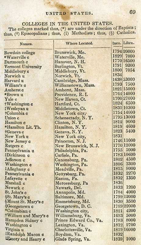Nineteenth-century schoolbooks bragged of the ever-increasing number of US colleges and their libraries, a mark of advancing civilization on the continent. Here’s a list from 1841.